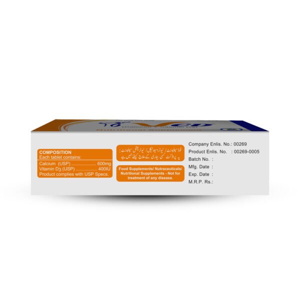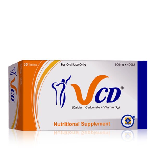 VCD Tablet 600mg + 200 IU combines Calcium and Vitamin D3 in a convenient tablet form to promote bone density and dental health. It helps reduce the risk of fractures and enhances calcium absorption for stronger bones and teeth. Suitable for daily supplementation, especially for those at risk of calcium or vitamin D deficiency.